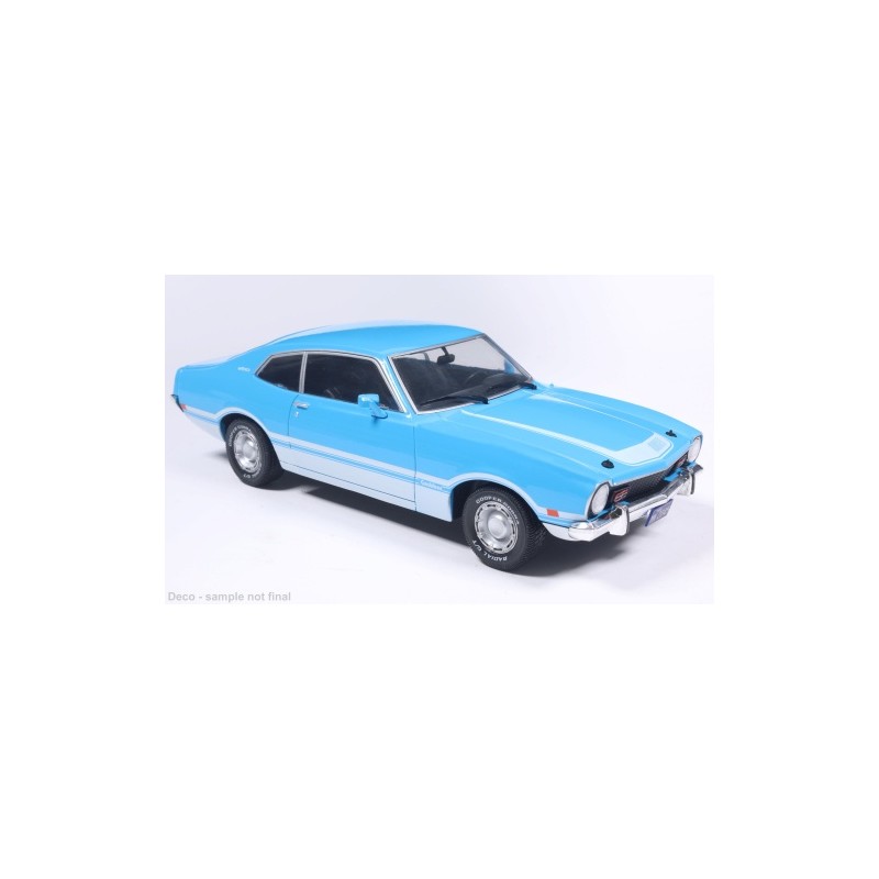 Miniature diecast car 1/24 de la Ford Maverick année 1974 couleur Light Blue White. Modèle réduit de voiture Whitebox WB124288. Catalogue Miniatures automobile Whitebox 2026. Maquette auto de collection.