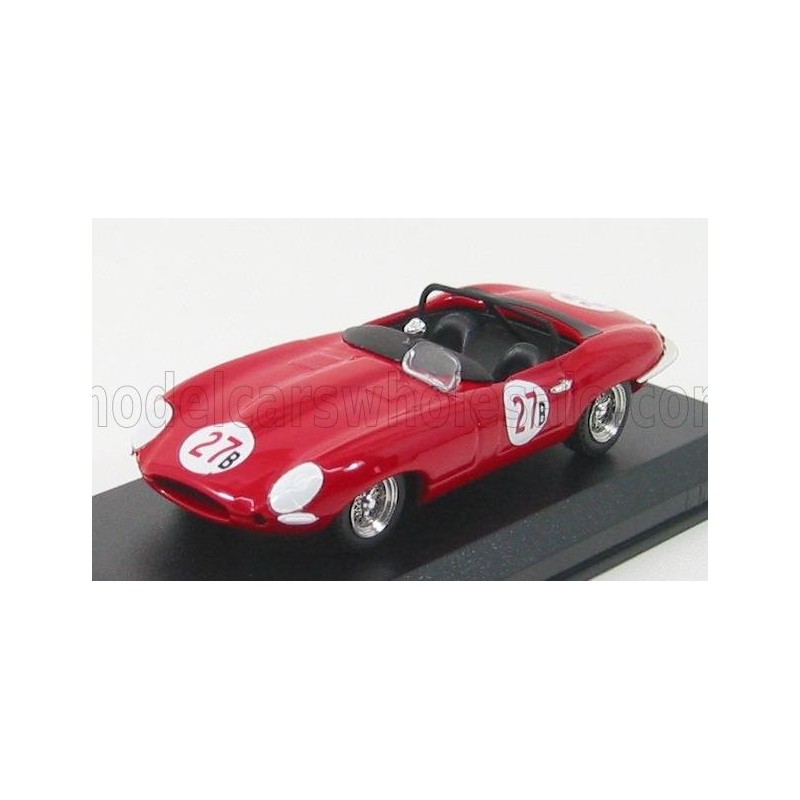 Miniature diecast car racing 1/43 de la Jaguar E-Type Spider n 27 pilotée par Bill Krause aux en SCCA Riverside 1961. Modèle réduit de voiture Best Model 9353. Catalogue Miniatures automobile Best Model 2021. Maquette auto de collection.