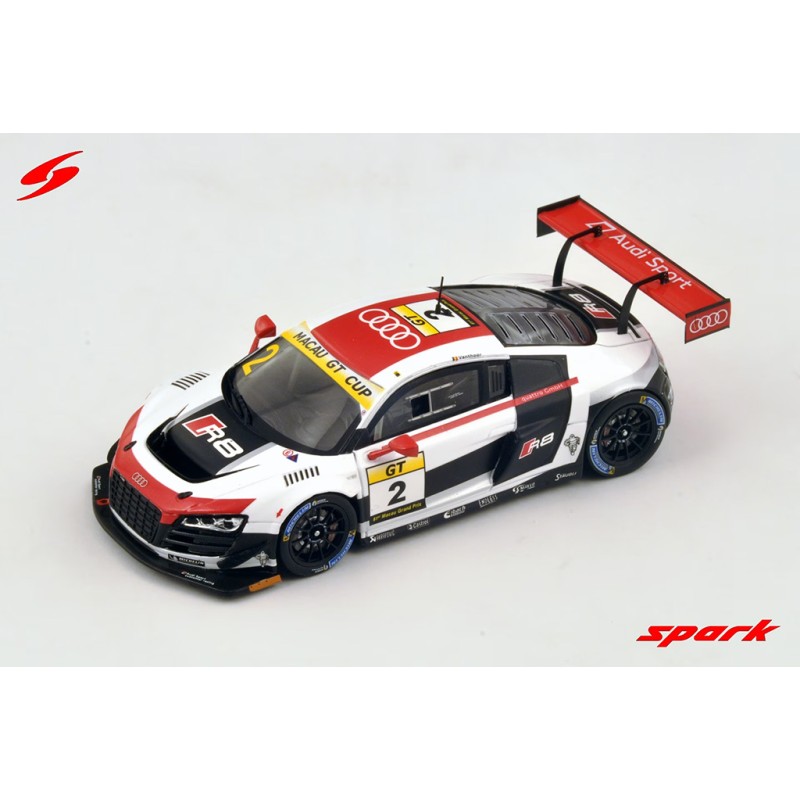 Miniature diecast car racing 1/43 de l'Audi R8 LMS Ultra n 2 pilotée par Laurens Vanthoor au Macau GP 2014. 4th. Limited Edition 300 pcs. Modèle réduit de voiture Spark SA071. Catalogue Miniatures automobile Spark 2026. Maquette auto de collection.