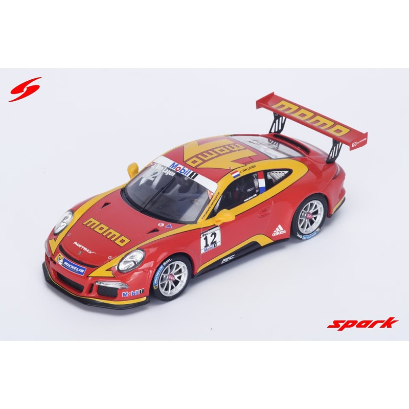 Miniature diecast car racing 1/43 de la Porsche Mobil 1 Supercup n 12 pilotée par Jaap Van Lagen en Porsche Supercup 2015. Limited Edition 500 pcs. Modèle réduit de voiture Spark SI003. Catalogue Miniatures automobile Spark 2026. Maquette auto de collection.
