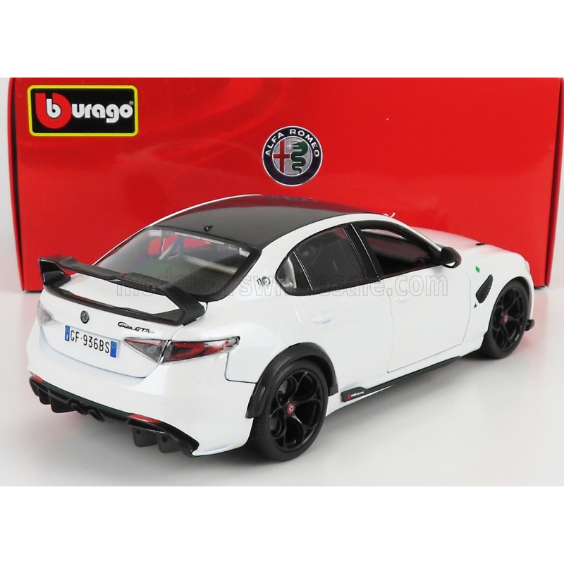 Miniature diecast car 1/18 de l'Alfa Romeo Giulia GTAm année 2020 couleur Bianco Trofeo. Modèle réduit de voiture Bburago BU01448. Catalogue Miniatures automobile Bburago 2022. Maquette auto de collection.