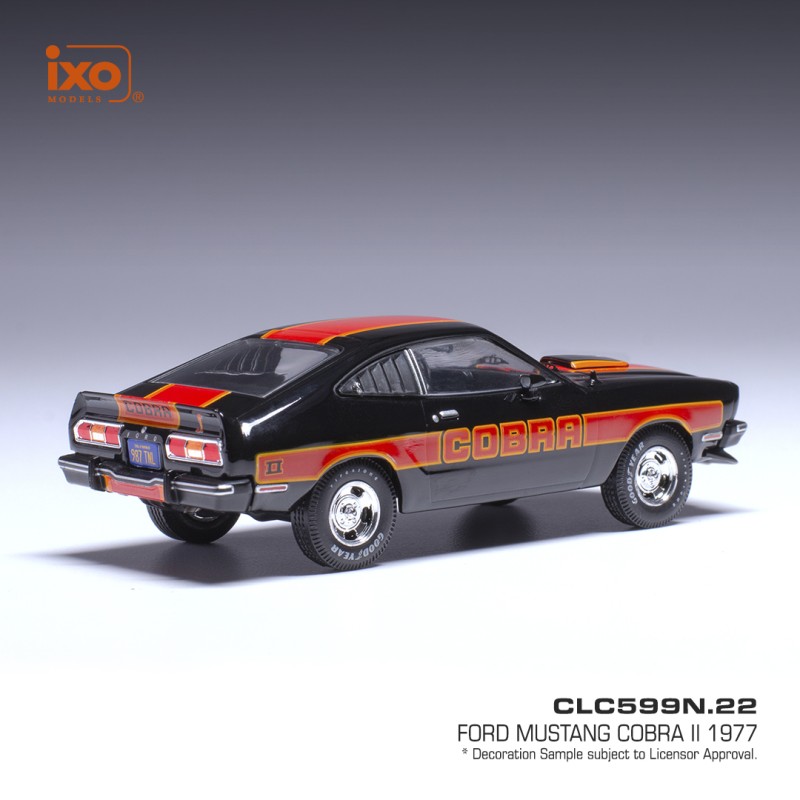 Miniature diecast car 1/43 de la Ford Mustang II Cobra année 1977 couleur Black decorated. Modèle réduit de voiture IXO CLC599N. Catalogue Miniatures automobile IXO 2025. Maquette auto de collection.