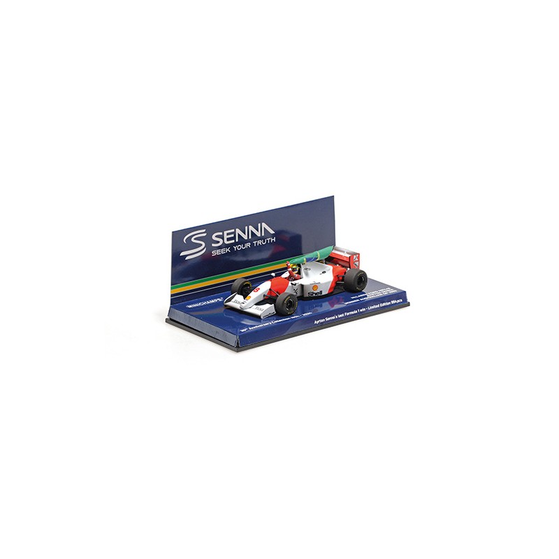 Miniature diecast F1 1/43 de la McLaren Ford MP4/8 - Dirty version with flag McLaren pilotée par Ayrton Senna au Grand Prix d'Australie 1993 de Formule 1. Winner. Modèle réduit de voiture Minichamps 540933308. Catalogue Miniatures automobile Minichamps 2024. Maquette auto de collection.