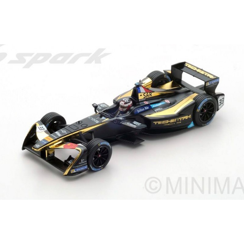 Miniature diecast racing 1/43 de la Techeetah n 33 pilotée par Stéphane Sarrazin en Formula E en 2017. New York Round 9 2017. Modèle réduit de voiture Spark S5917. Maquette auto de collection.