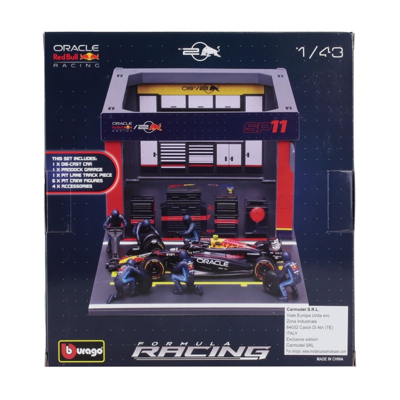 Miniature diecast F1 1/43 de la Red Bull RB20 Diorama Garage Pit-Stop n 11 pilotée par Sergio Perez lors de la saison 2024 de Formule 1. Modèle réduit de voiture Bburago 18-38453-P. Catalogue Miniatures automobile Bburago 2025. Maquette auto de collection.