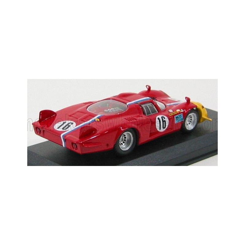 Miniature diecast car racing 1/43 de l'Alfa Romeo 33.2 Coda Lunga n 16 pilotée par Teddy Pilette lors d'essais à Spa Francorchamps en 1968. Modèle réduit de voiture Best Model BEST9435. Catalogue Miniatures automobile Best Model 2022. Maquette auto de collection.
