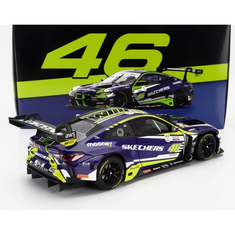 Miniature diecast car racing 1/18 de la BMW M4 GT3 n 46 team WRT pilotée par Valentino Rossi - Maxime Martin - Augusto Farfus lors des 24 Heures de Spa Francorchamps 2023. Modèle réduit de voiture Minichamps 113232646. Catalogue Miniatures automobile Minichamps 2024. Maquette auto de collection.