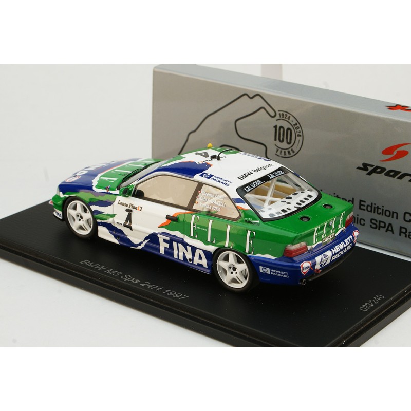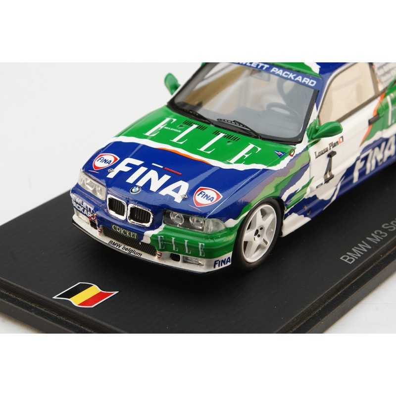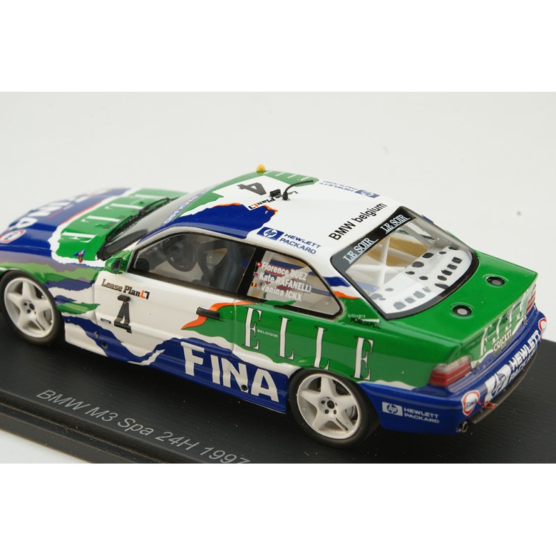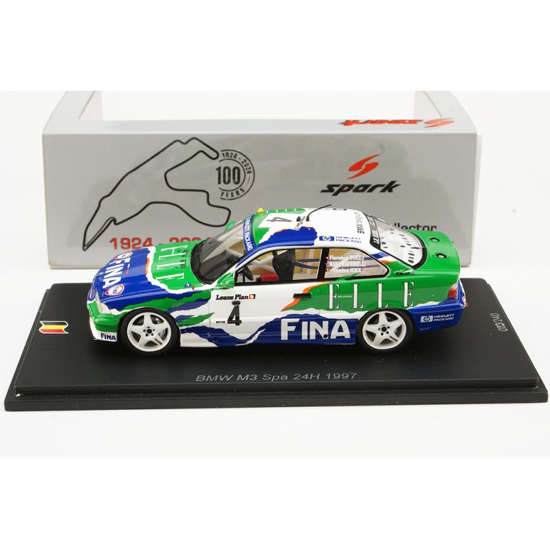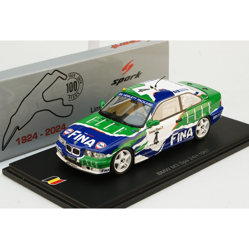 Miniature diecast car racing 1/43 de la BMW M3 E36 n 4 BMW FINA pilotée par Duez - Ickx - Rafanelli aux 24 Heures de Spa Francorchamps 1997. Limited Edition 324 pcs. Modèle réduit de voiture Spark 100SPA14. Catalogue Miniatures automobile Spark 2024. Maquette auto de collection.