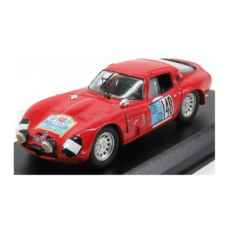 Miniature diecast rally 1/43 de l'Alfa Romeo TZ2 n 148 pilotée par De Adamich - Lini au Rally Pergusa Jolly Hotel 1965. Modèle réduit de voiture de rallye Best Model 9705. Catalogue Miniatures automobile Best Model 2021. Maquette auto de collection.