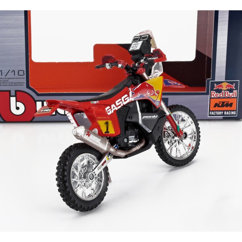 Miniature diecast rally 1/18 de la KTM RX450F n 1 Team Redbull Gasgas Racing pilotée par Sam Sunderland au Rallye Dakar 2023. Modèle réduit de moto Dakar Bburago BU51091. Catalogue Miniatures motos Bburago 2024. Maquette moto de collection.