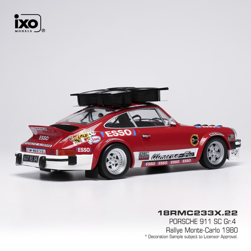 Miniature diecast rally 1/18 de la Porsche 911 SC Gr.4 service assistance du Rallye Monte Carlo 1980. Modèle réduit de voiture de rallye IXO 18RMC233X. Catalogue Miniatures automobile IXO 2025. Maquette auto de collection.