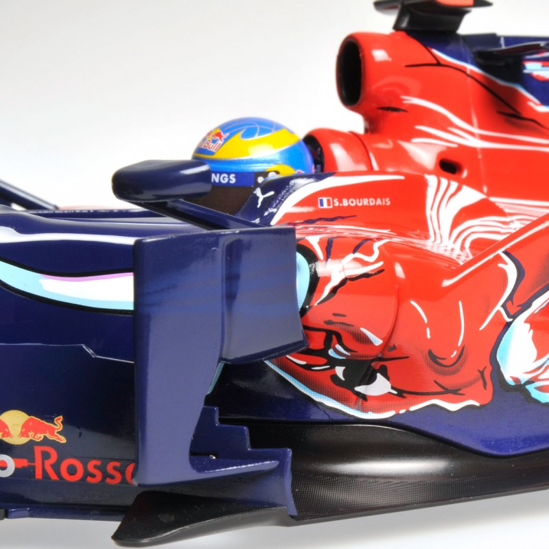Miniature diecast F1 1/18 de la Scuderia Toro Rosso STR3 pilotée par Sébastien Bourdais au Grand Prix d'Italie à Monza en 2008. Modèle réduit de voiture Minichamps 150080014. Maquette auto de collection.
