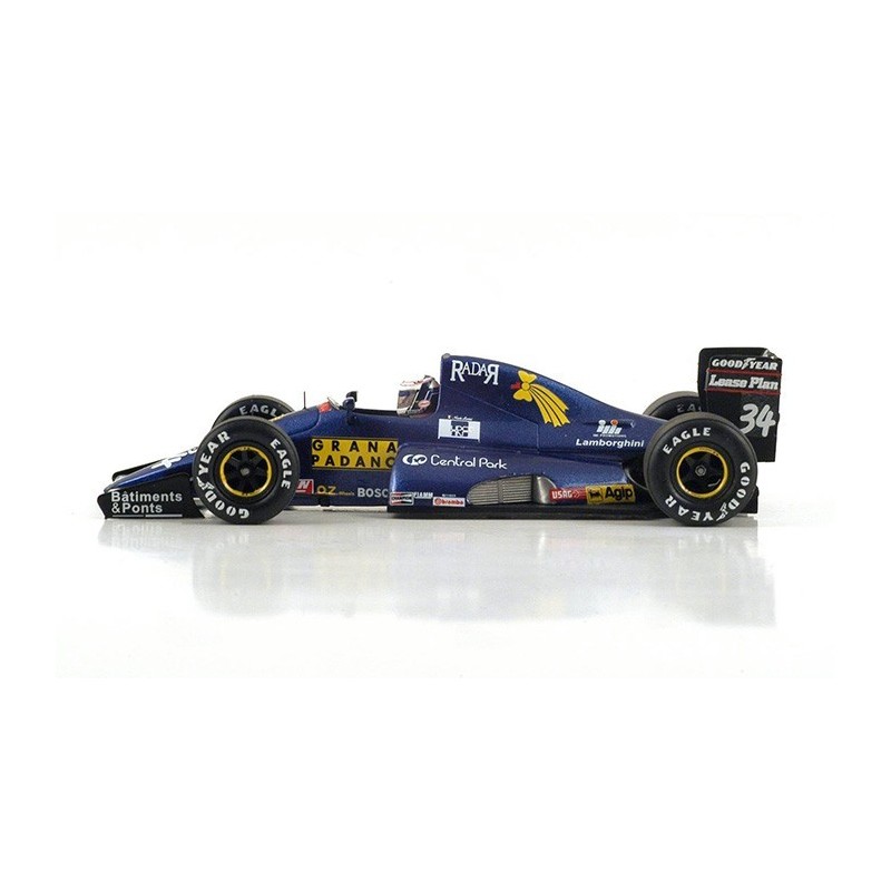 Miniature diecast F1 1/43 de la Team Modena n 34 pilotée par Nicolas Larini en Formule 1 en 1991. Modèle réduit de voiture Spark S1717. Maquette auto de collection.