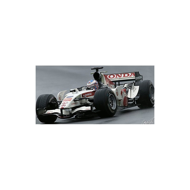 Miniature diecast F1 1/43 de la Honda RA106 pilotée par Jenson Button lors de sa 1ère victoire en Formule 1 au Grand Prix de Hongrie 2006. Modèle réduit de voiture Minichamps 400060412. Maquette auto de collection.