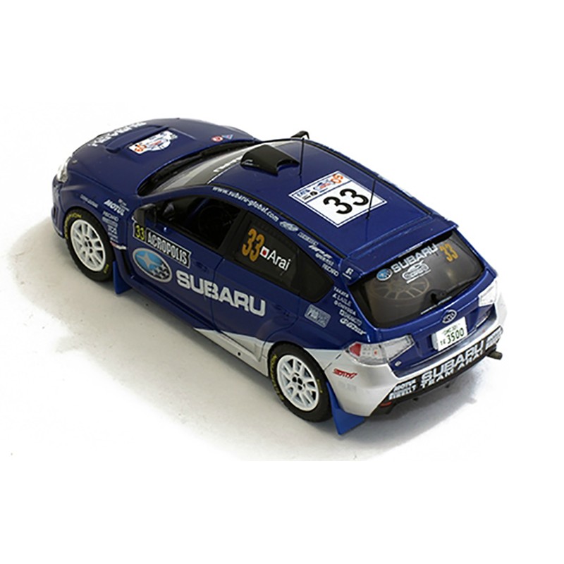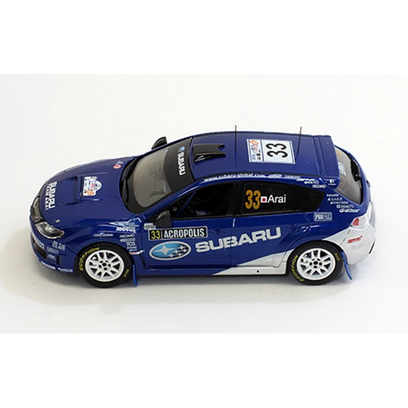 Miniature diecast racing 1/43 de la Subaru Impreza WRX STI Group N n 33 du Rallye de l'Acropole 2009 pilotée par Arai - Macneall. Modèle réduit de voiture IXO JC195. Maquette Rallye auto de collection.