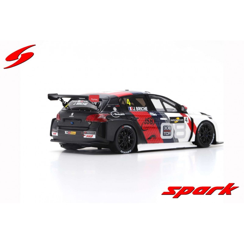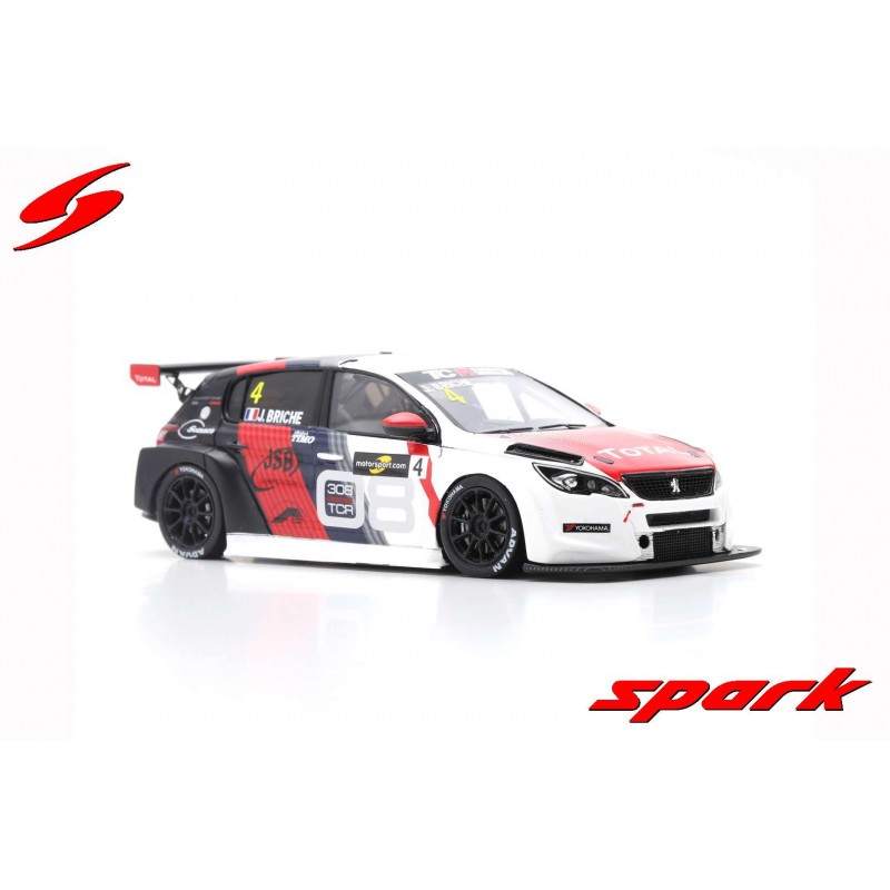 Miniature diecast car racing 1/43 de la Peugeot 308 TCR n 4 pilotée par Julien Briché en TCR Europe lors de sa victoire à la Race 2 à Spa Francorchamps en 2018. Modèle réduit de voiture Spark S5197. Catalogue Miniatures automobile Spark 2019. Maquette auto de collection.