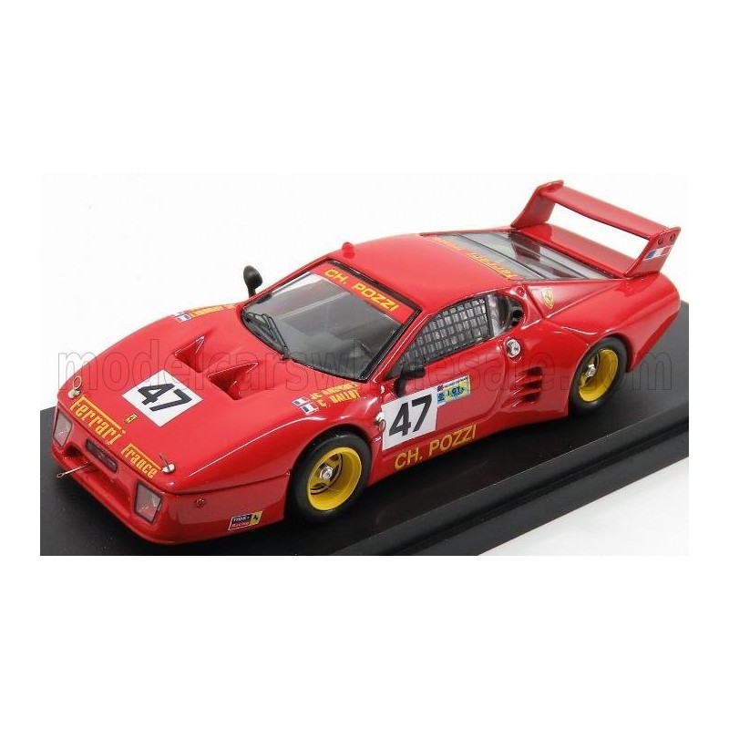 Miniature diecast Le Mans 1/43 de la Ferrari 512 BB ch Pozzi n 47 pilotée par Ballot Lena - Andruet aux 24 Heures Le Mans 1981. Winner Class GTX. Modèle réduit de voiture Best Model 9671. Catalogue Miniatures automobile 24h Best Model 2021. Maquette auto de collection.