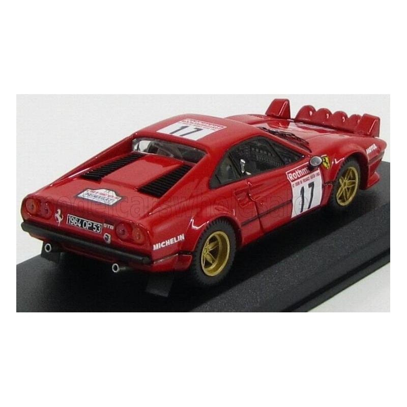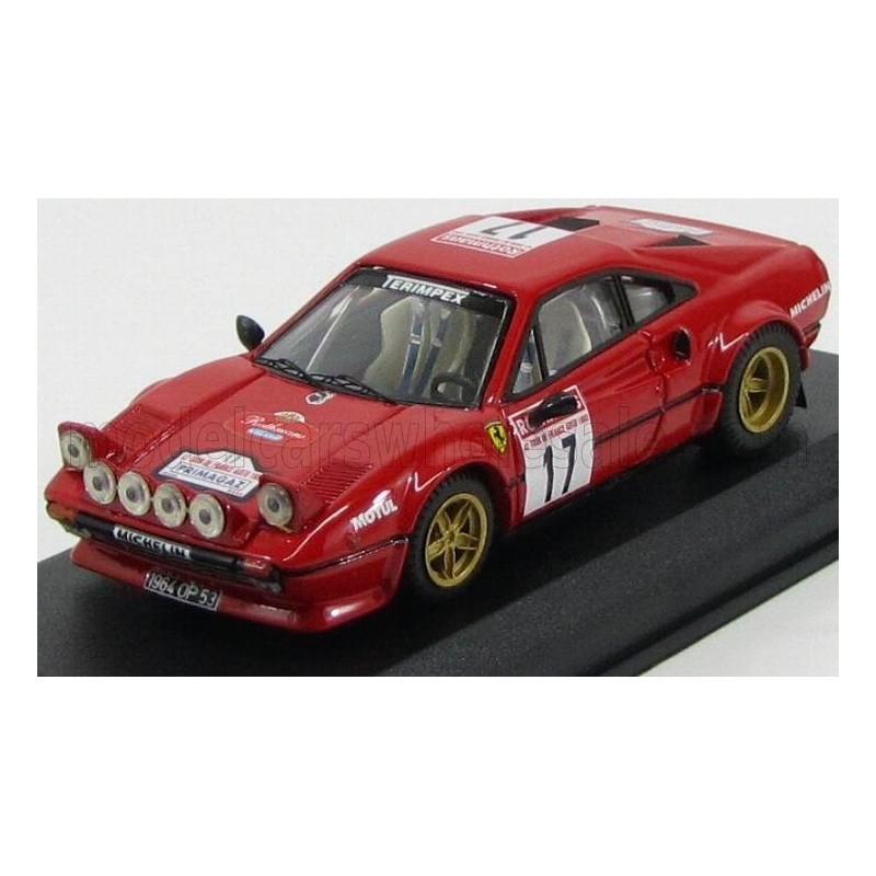 Miniature diecast rally 1/43 de la Ferrari 308 GTB n 17 pilotée par Bouteloup - Panic au Tour de France 1953. Modèle réduit de voiture de rallye Best Model 9533. Catalogue Miniatures automobile Best Model 2021. Maquette auto de collection.