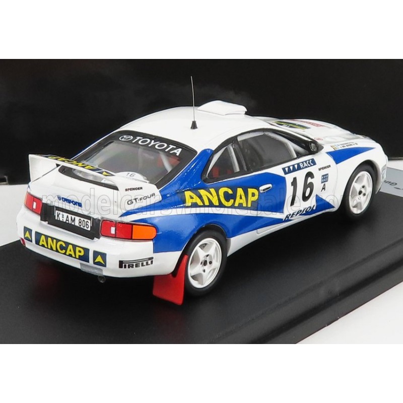 Miniature diecast rally 1/43 de la Toyota Celica GT Four n 16 pilotée par Trelles - Del Buono au Rallye de Catalogne 1995. Modèle réduit de voiture de rallye Trofeu TRORRES04. Catalogue Miniatures automobile Trofeu 2022. Maquette auto de collection.