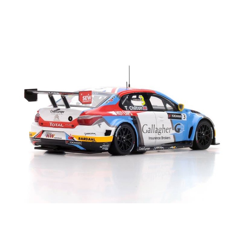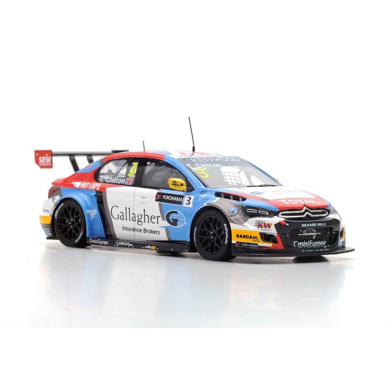 Miniature diecast racing 1/43 de la Citroen C-Elysée n 3 pilotée par Tom Chilton en WTCC en Argentine en 2016. Winner Race 1.Modèle réduit de voiture Spark S5097. Maquette auto de collection.