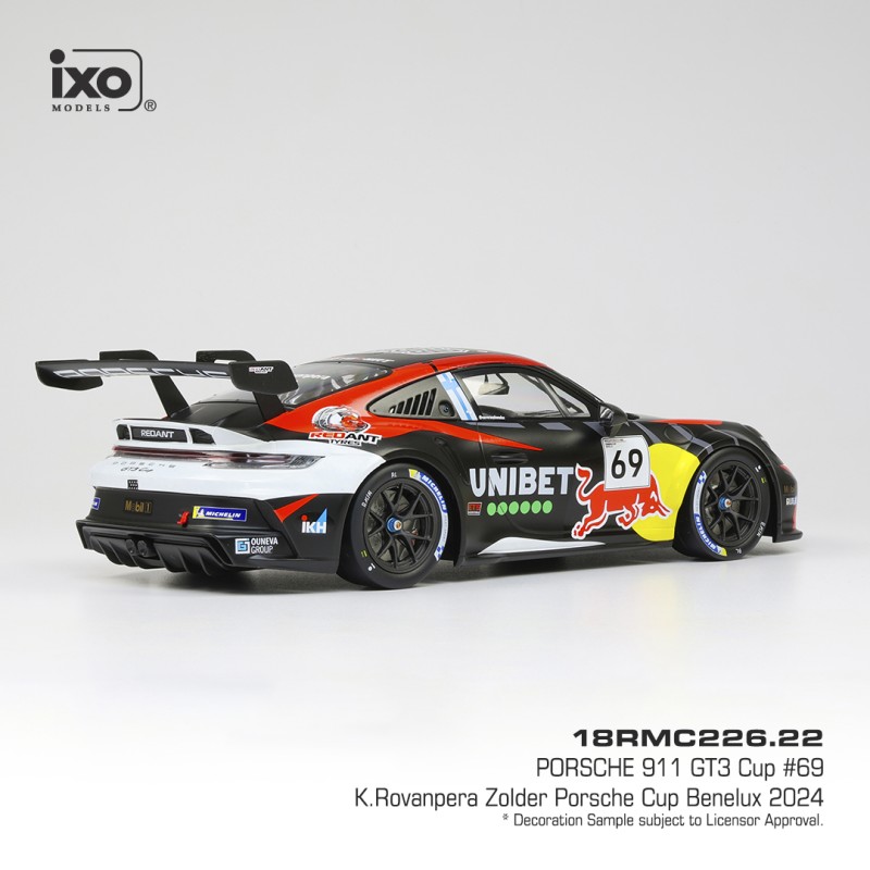 Miniature diecast car racing 1/18 de la Porsche 911 GT3 Cup n 69 pilotée par Kalle Rovanpera en Porsche Cup à Zolder en 2024. Modèle réduit de voiture IXO 18RMC226. Catalogue Miniatures automobile IXO 2025. Maquette auto de collection.