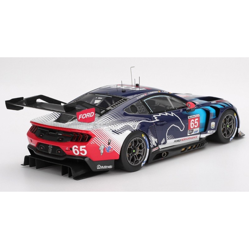 Miniature diecast car racing 1/18 de la Ford Mustang GT3 n 65 Ford Multimatic Motorsports pilotée par Vervisch - Olsen - Mies aux 24 Heures de Daytona 2025. Modèle réduit de voiture Truescale TS0641. Catalogue Miniatures automobile Truescale 2025. Maquette auto de collection.