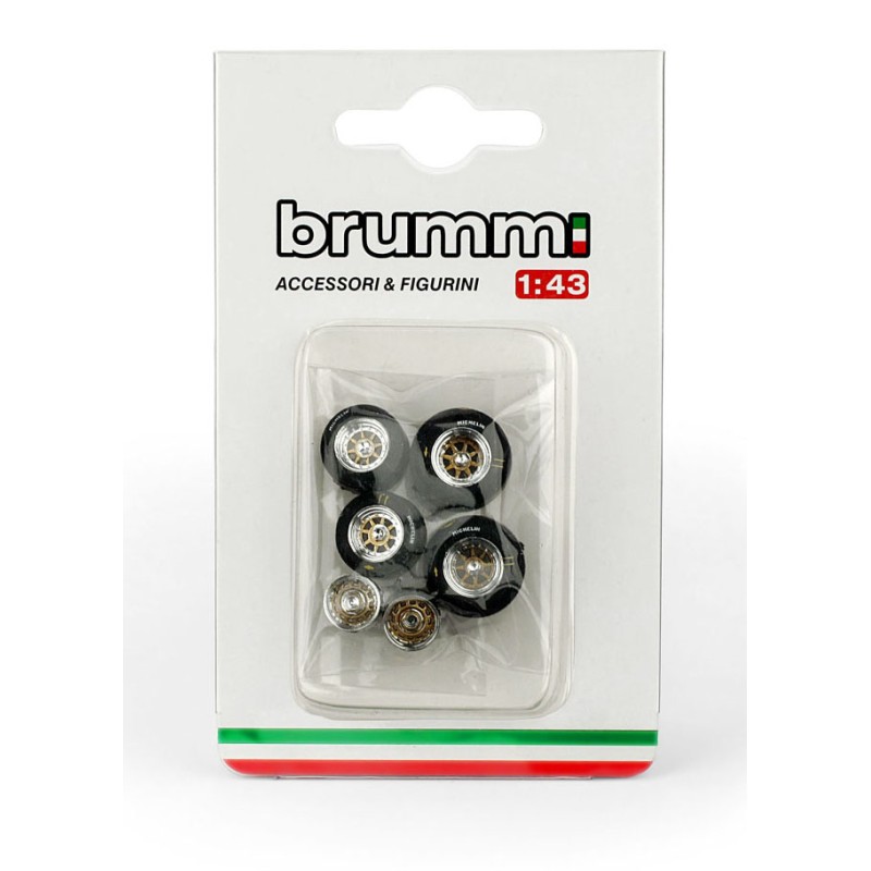 Miniature diecast F1 1/43 Set Pneus Slick Michelin F1 Ferrari lors de la saison 1981 de Formule 1. 4 pneus jantés + 2 jantes avant. Modèle réduit de voiture Brumm F099. Catalogue Miniatures automobile Brumm 2025. Maquette auto de collection.