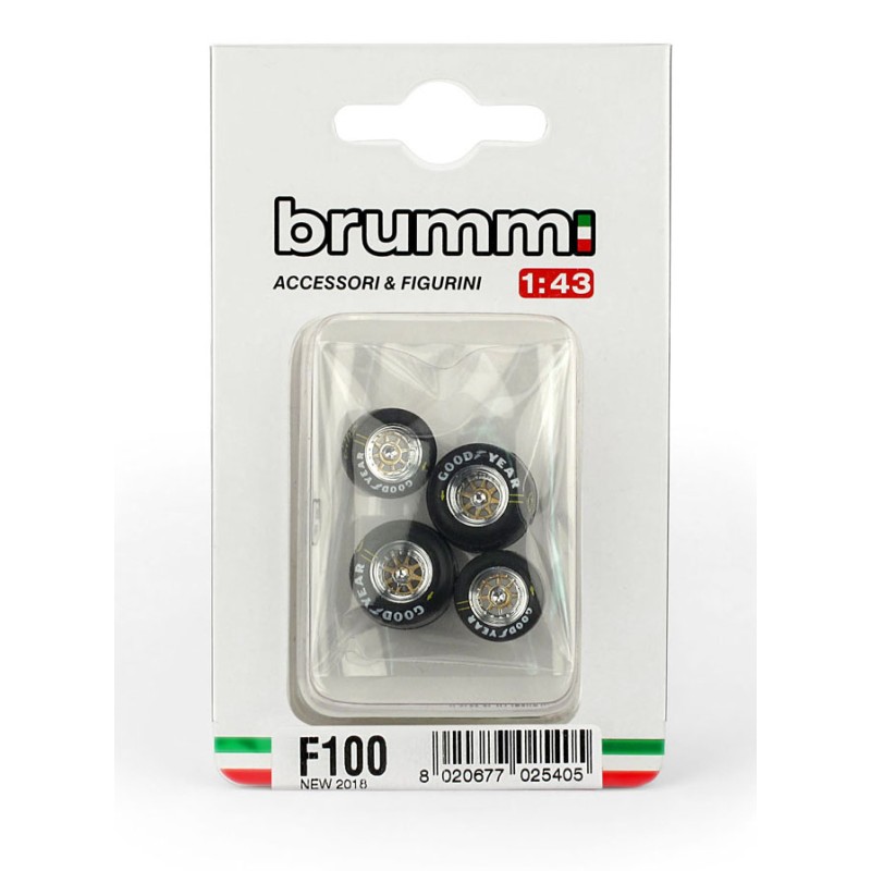 Miniature diecast F1 1/43 Set Pneus Slick Goodyear F1 Ferrari lors de la saison 1982 de Formule 1. Modèle réduit de voiture Brumm F100. Catalogue Miniatures automobile Brumm 2025. Maquette auto de collection.