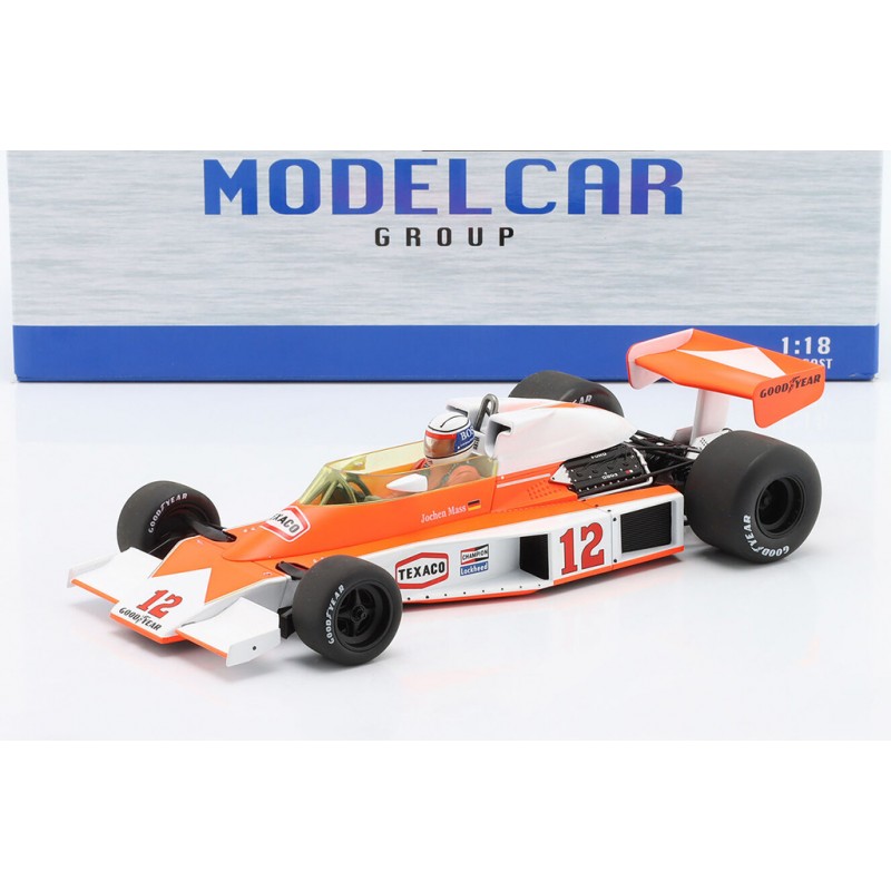 Miniature diecast F1 1/18 de la McLaren M23 n 12 pilotée par Jochen Mass au Grand Prix d'Allemagne 1976 de Formule 1. Modèle réduit de voiture MCG MCG18613F. Catalogue Miniatures automobile MCG 2021. Maquette auto de collection.