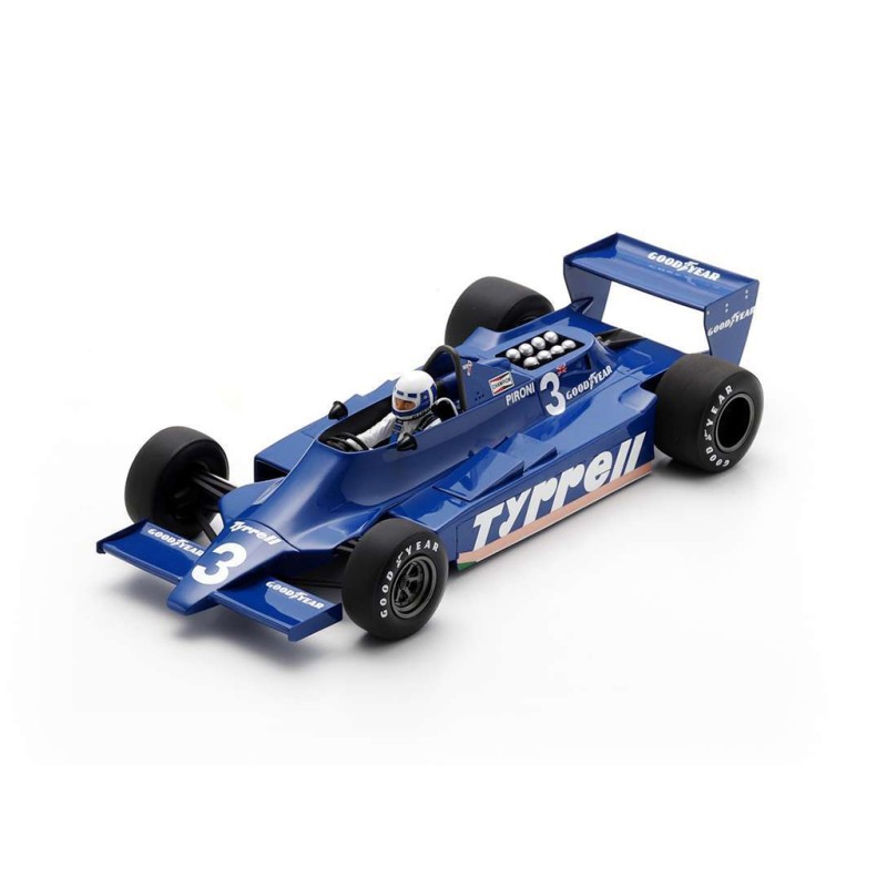 Miniature diecast F1 1/18 de la Tyrrell 009 n 3 pilotée par Didier Pironi au Grand Prix du Brésil 1979 de Formule 1. 4th. Modèle réduit de voiture Spark 18S742. Catalogue Miniatures automobile Spark 2025. Maquette auto de collection.