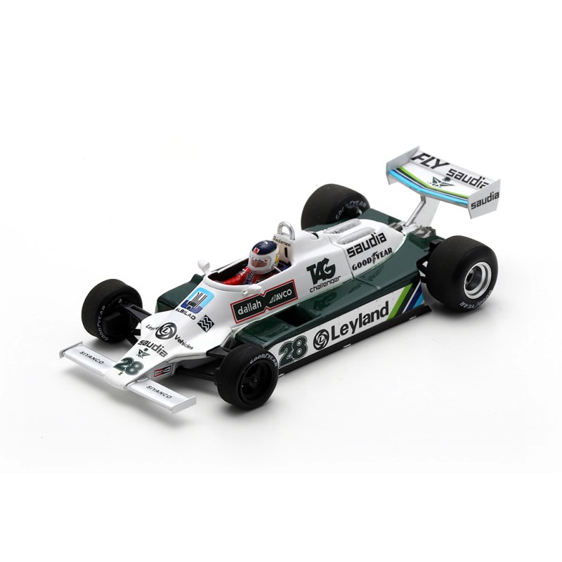 Miniature diecast F1 1/43 de la Williams FW07B n 28 pilotée par Carlos Reutemann au Grand Prix de Monaco 1980 de Formule 1. Winner. Modèle réduit de voiture Spark S6993. Catalogue Miniatures automobile Spark 2025. Maquette auto de collection.