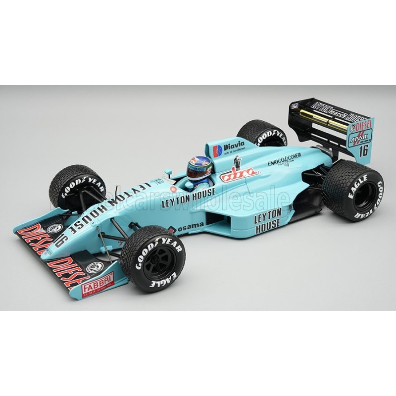 1/18 F1 diecast miniature of the Leyton House March Judd 881 n 16 driven by Ivan Capelli at the 1988 Formula 1 German Grand Prix. Rain tires with driver. Tecnomodel TMD18-424C model car. Tecnomodel 2026 automobile miniatures catalog. Collectible car model.