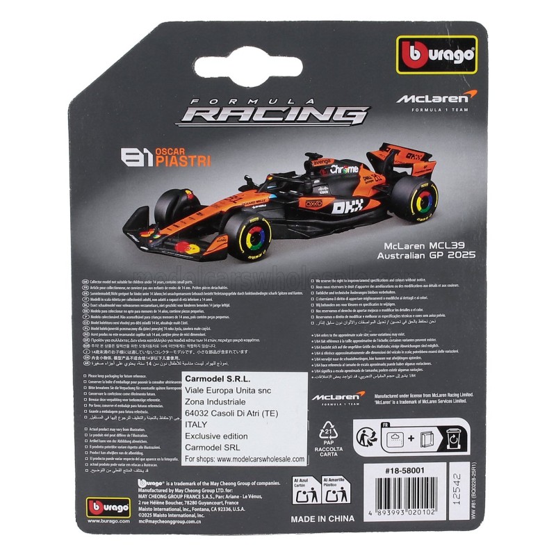 McLaren Mercedes MCL39 81 Oscar Piastri F1 2025 Bburago BU58001-P