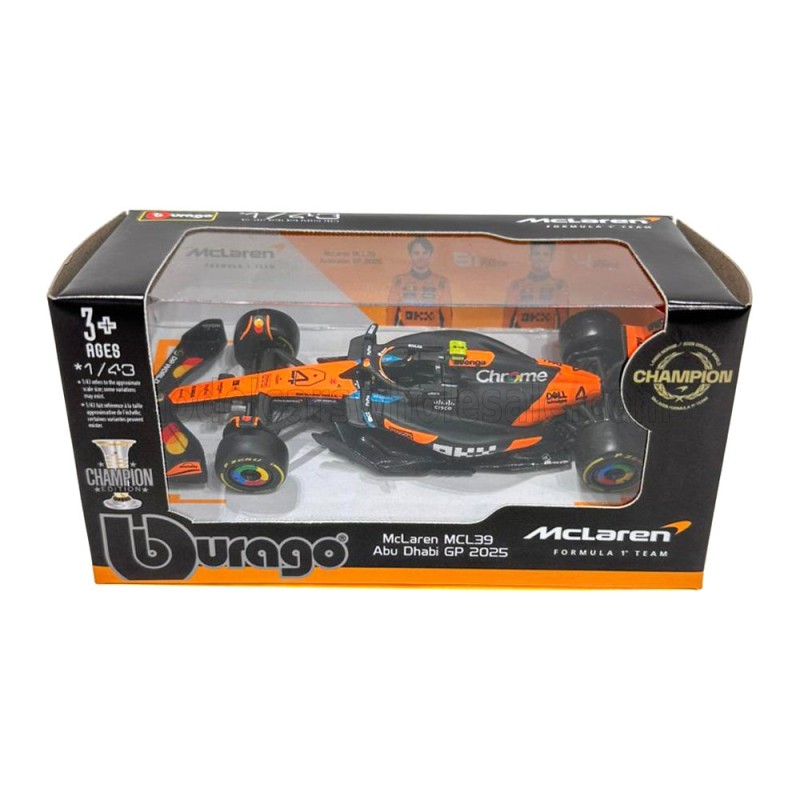 1/43 scale F1 diecast model of the McLaren Mercedes MCL39 No. 4 driven by Lando Norris at the Abu Dhabi Grand Prix 2025 Formula 1. 3rd. World Champion. diecast car model Bburago BU38248-02397. Bburago 2026 model car catalogue. Collectible car model.
