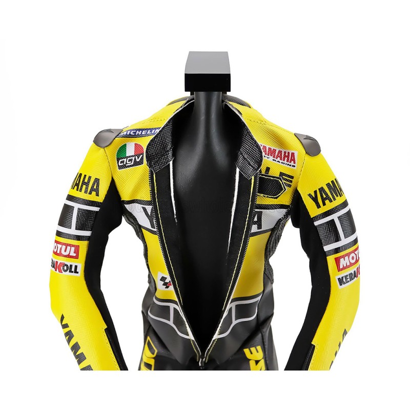 1/4 scale bike diecast model of the Dainese Racing Suit Combinaison de Valentino Rossi à Laguna Seca en Moto GP en 2005. Yamaha YZR-M1. World Champion. True To Original-Zip Closure-Height 35.6cm-Support 41.2cm. diecast bike model Microart Racing MAR04VR0003. model catalogue motos Microart Racing 2026. Maquette motorcycle de collection.