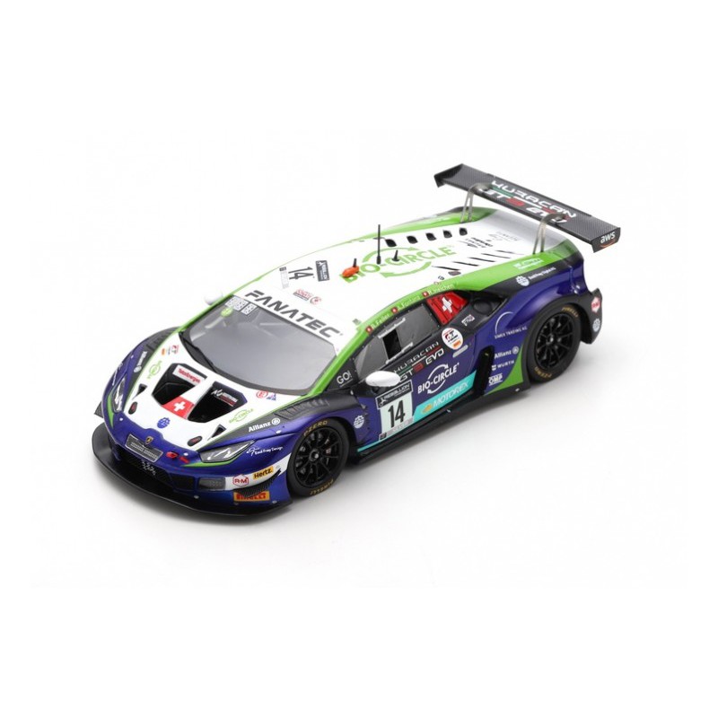 Miniature diecast car racing 1/43 de la Lamborghini Huracan GT3 Evo n 14 Emil Frey Racing pilotée par Fontana - Ineichen - Feller aux 24 Heures de Spa Francorchamps 2021. Limited Edition 300 pcs. Modèle réduit de voiture Spark SB455. Catalogue Miniatures automobile Spark 2021. Maquette auto de collection.