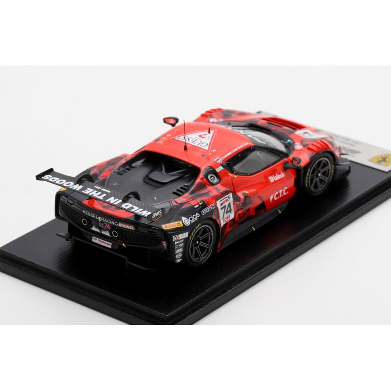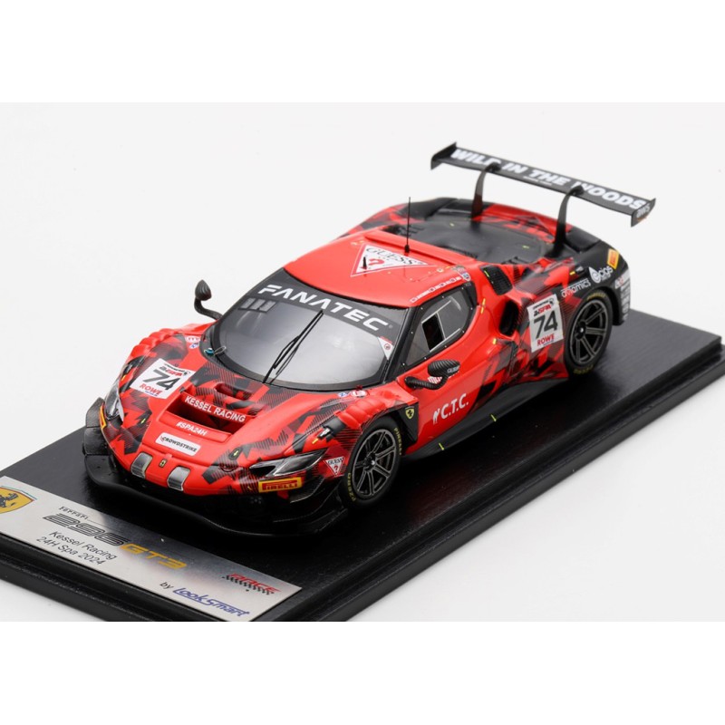 Miniature diecast car racing 1/43 de la Ferrari 296 GT3 n 74 Kessel Racing pilotée par Hartshorne - Tuck - Hull - Bell aux 24 Heures de Spa Francorchamps 2024. Modèle réduit de voiture Looksmart LSRC192. Catalogue Miniatures automobile Looksmart 2022. Maquette auto de collection.
