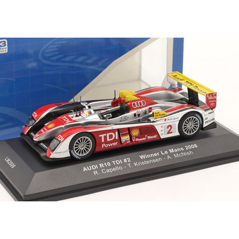 Miniature diecast Le Mans 1/43 de la Audi R10 TDI n 2 pilotée par McNish - Capello - Kristensen lors de leur victoire aux 24 Heures du Mans 2008. Modèle réduit de voiture IXO LM2008. Catalogue Miniatures automobile 24h IXO 2022. Maquette auto de collection.