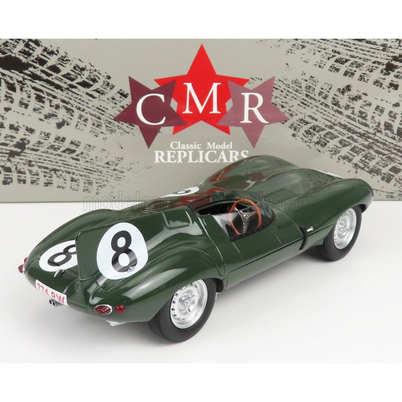 Miniature diecast Le Mans 1/18 de la Jaguar type D n 8 Team Jaguar Cars pilotée par Don Beauman - Norman Dewis aux 24 Heures du Mans 1955. Modèle réduit de voiture CMR CMR195. Catalogue Miniatures automobile 24h CMR 2023. Maquette auto de collection.