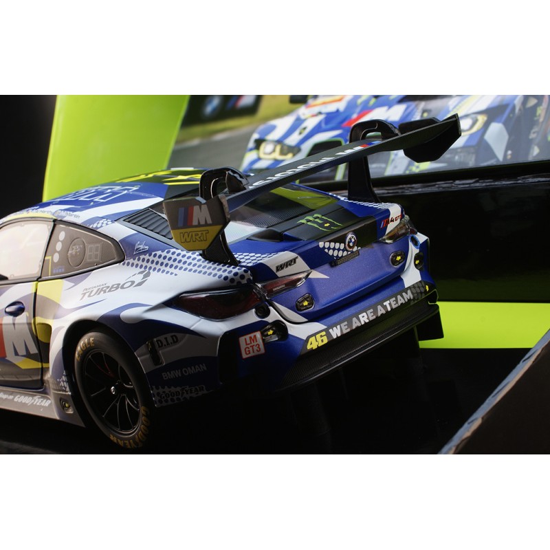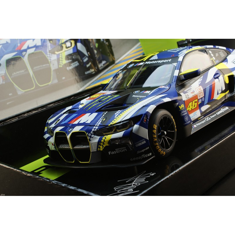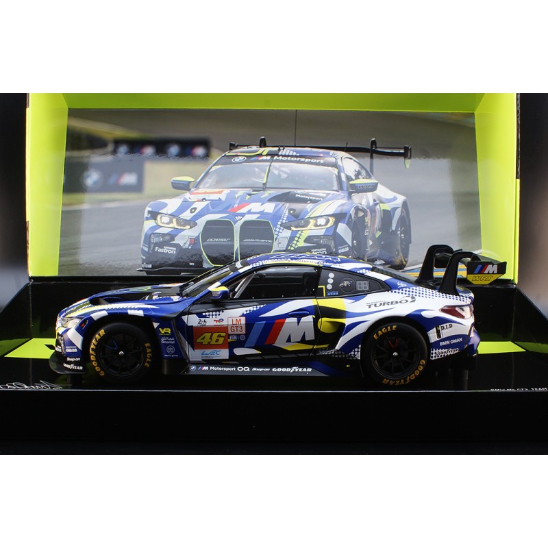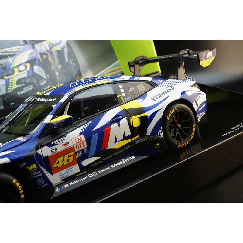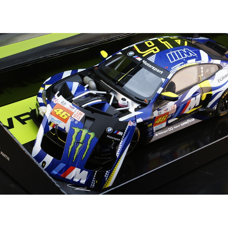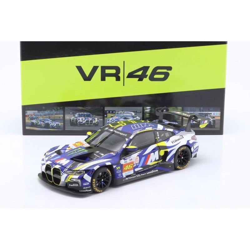 Miniature diecast car racing 1/18 de la BMW M4 GT3 n 46 team WRT pilotée par Valentino Rossi - Maxime Martin - Ahmad Al Harthy aux 24 Heures du Mans 2024. Modèle réduit de voiture Minichamps 113242446. Catalogue Miniatures automobile Minichamps 2025. Maquette auto de collection.