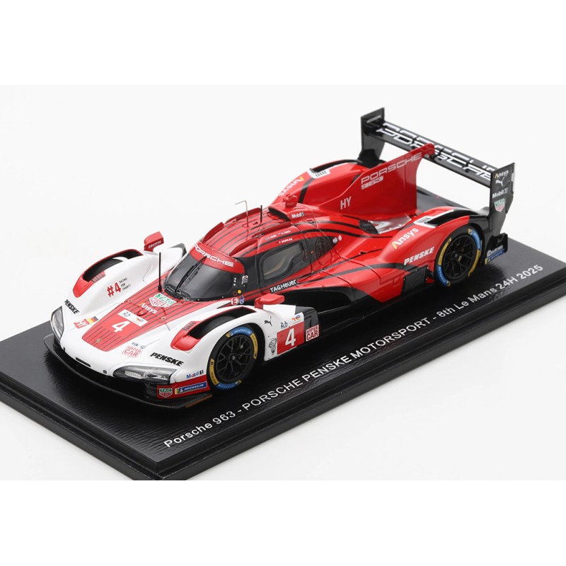 Miniature diecast Le Mans 1/43 de la Porsche 963 n 4 Porsche Penske Motorsport pilotée par Nasr - Tandy - Wehrlein aux 24 Heures du Mans 2025. 8th. Modèle réduit de voiture Spark S9256. Catalogue Miniatures automobile 24h Spark 2025. Maquette auto de collection.
