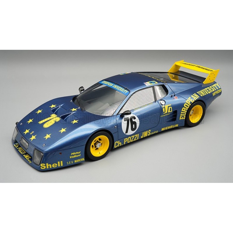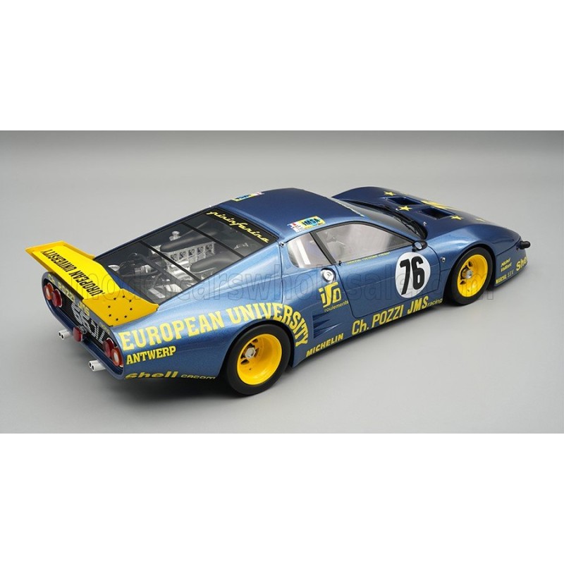 Le Mans 1/18 diecast miniature of the Ferrari 512BB LM 4.9L n 76 Charles Pozzi JMS Racing driven by Pierre Dieudonné - Jean Xhenceval - Hervé Regout at the 24 Hours of Le Mans 1980. Tecnomodel TM18-409G model car. 24h automobile miniatures catalog Tecnomodel 2026. Collectible car model.