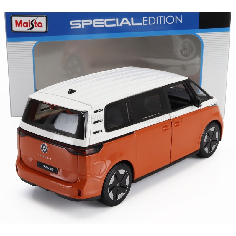 Miniature diecast car 1/24 de la Volkswagen ID.Buzz Minibus année 2023 couleur Orange White. Modèle réduit de voiture Maisto MAI32914OR. Catalogue Miniatures automobile Maisto 2024. Maquette auto de collection.