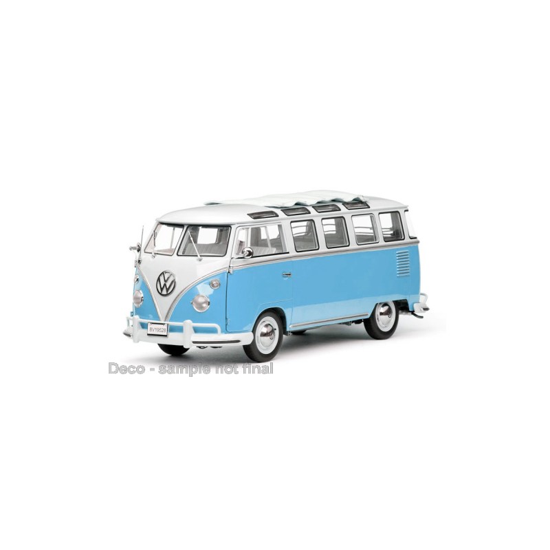 Miniature diecast car 1/12 de la Volkswagen T1 Samba couleur White Light Blue. Modèle réduit de voiture Sunstar SUN5086. Catalogue Miniatures automobile Sunstar 2024. Maquette auto de collection.