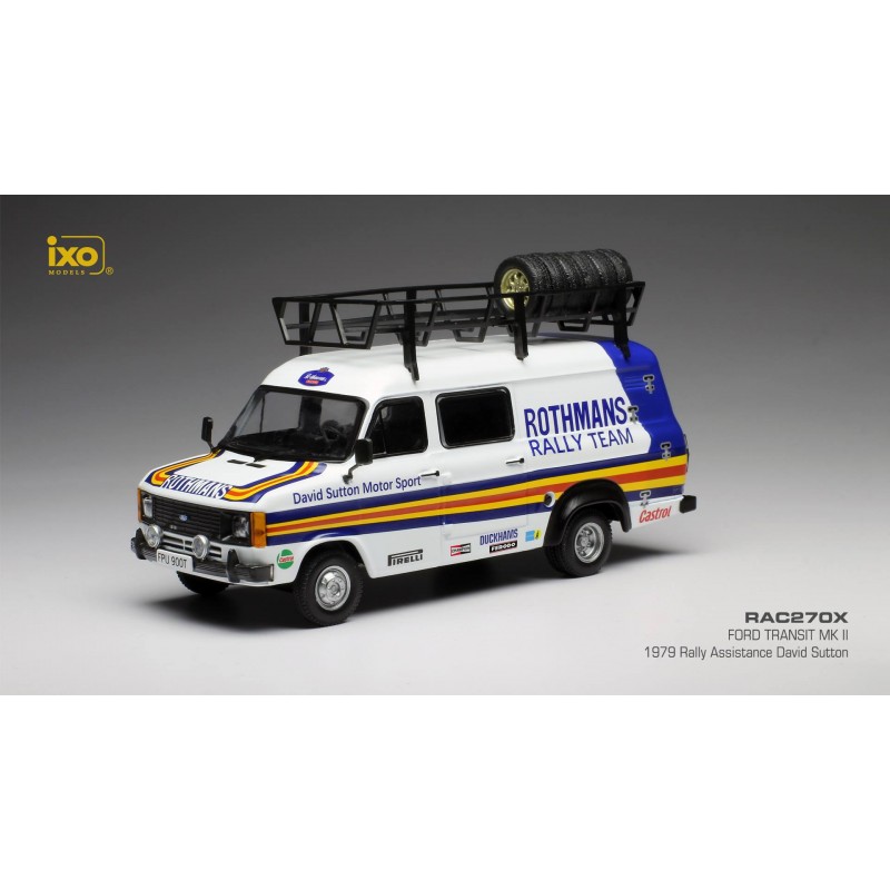 Miniature diecast rally 1/43 du Ford Transit MKII Rally Assistance David Sutton en 1979. Modèle réduit de voiture IXO RAC270X. Maquette auto de collection.