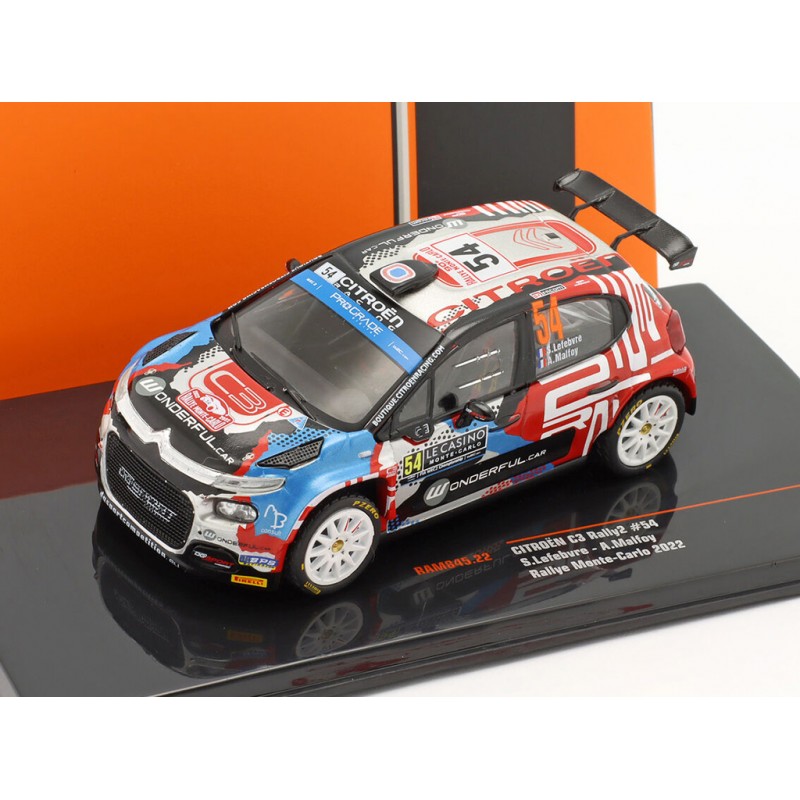 Miniature diecast rally 1/43 de la Citroen C3 Rally2 n 54 pilotée par Lefebvre - Malfoy au Rallye Monte Carlo 2022. Modèle réduit de voiture de rallye IXO RAM845. Catalogue Miniatures automobile IXO 2022. Maquette auto de collection.