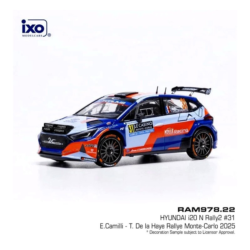 Miniature diecast rally 1/43 de la Hyundai I20 N Rally2 n 31 Hyundai Motorsport pilotée par Eric Camilli - Thibault De La Haye au Rallye Monte Carlo 2025. Modèle réduit de voiture de rallye IXO RAM978. Catalogue Miniatures automobile IXO 2025. Maquette auto de collection.