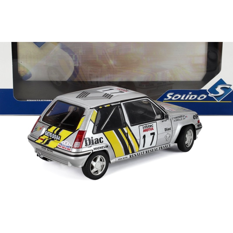 Miniature diecast rally 1/18 de la Renault R5 Supercinque GT Turbo n 17 Team Simon Racing pilotée par Alain Oreille - Gilles Thimonier au Rallye Tour de Corse 1989. Modèle réduit de voiture de rallye Solido S1810005. Catalogue Miniatures automobile Solido 2025. Maquette auto de collection.
