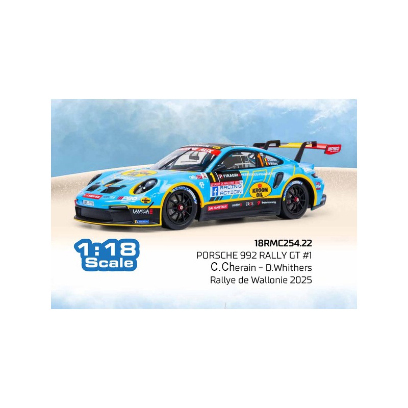 Miniature diecast rally 1/18 de la Porsche 992 Rally GT n 1 pilotée par C. Cherain - D. Withers au Rallye de Wallonie 2025. Modèle réduit de voiture de rallye IXO 18RMC254. Catalogue Miniatures automobile IXO 2026. Maquette auto de collection.