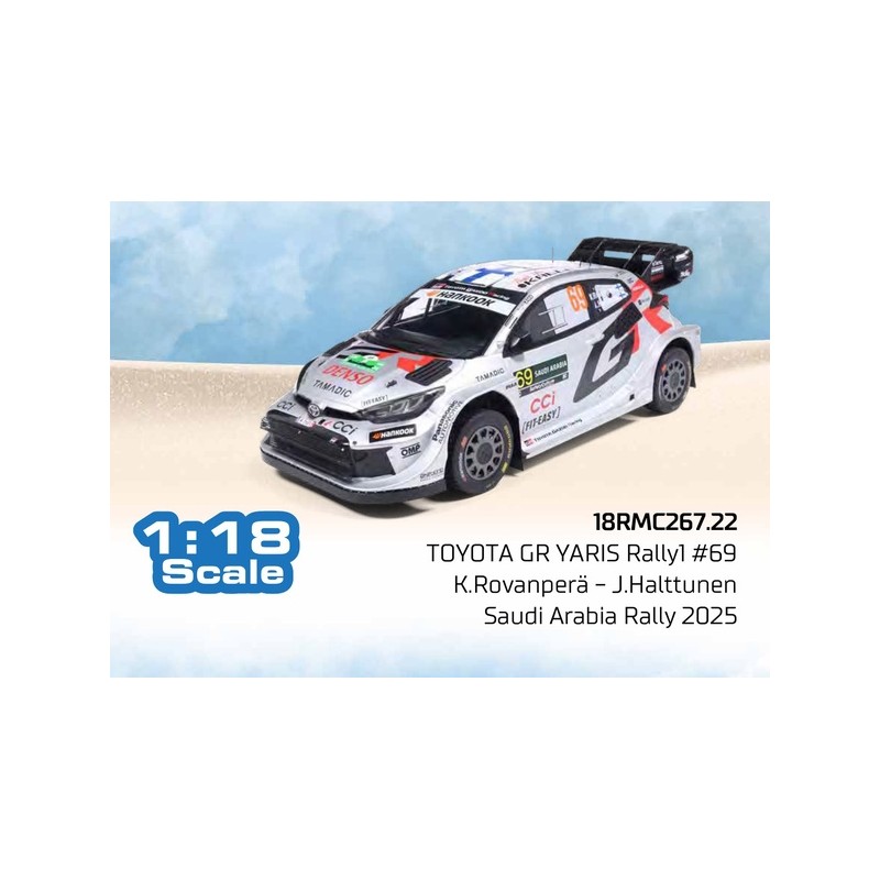 Miniature diecast rally 1/18 de la Toyota GR Yaris Rally1 n 69 pilotée par K. Rovanpera - J. Halttunen au Rallye d'Arabie Saoudite 2025. Modèle réduit de voiture de rallye IXO 18RMC267. Catalogue Miniatures automobile IXO 2026. Maquette auto de collection.